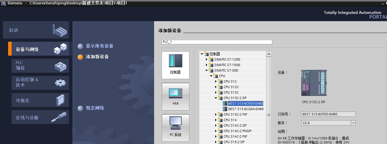 四、添加 PLC 主機,示例中使用的是 S7-300 (6ES7 313-6CF03-0AB0):