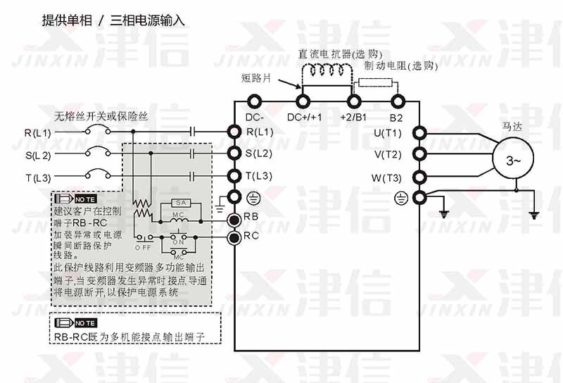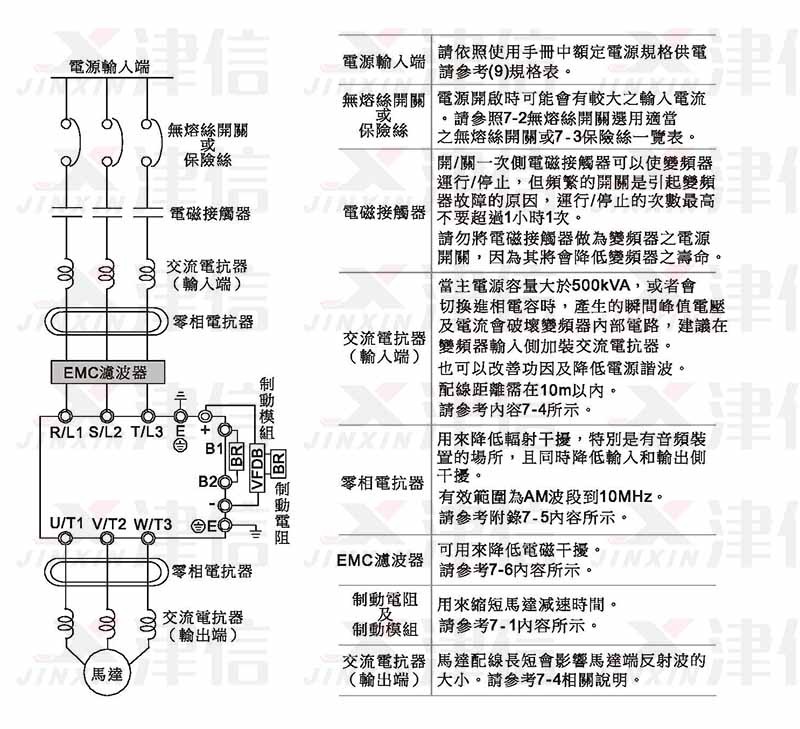 變頻器的主回路電源端子 R/L1、S/L2、T/L3 是輸入電源端。如果將電源錯 誤連接于真E端子,則將損壞變頻器。另外應確認電源應在銘牌標示的允許