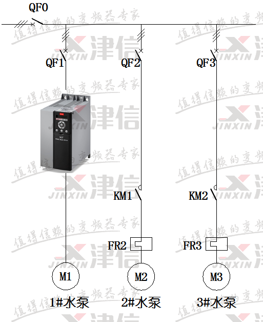丹佛斯FC111是新一代的風機水泵專用型變頻器,這里我們介紹FC111多泵控制一拖三恒壓供水固定模式的詳細應用。