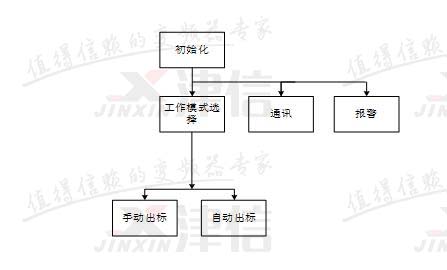 開機后,首先進行程序的初始化。初始化完成后同時調用工作模式選擇、報警和PLC與變頻器之間的通訊程序。工作模式中,包含手動出標、自動出標兩種狀態。報警程序用于對機器狀態進行實時監控,并根據故障情況執行相關動作。
