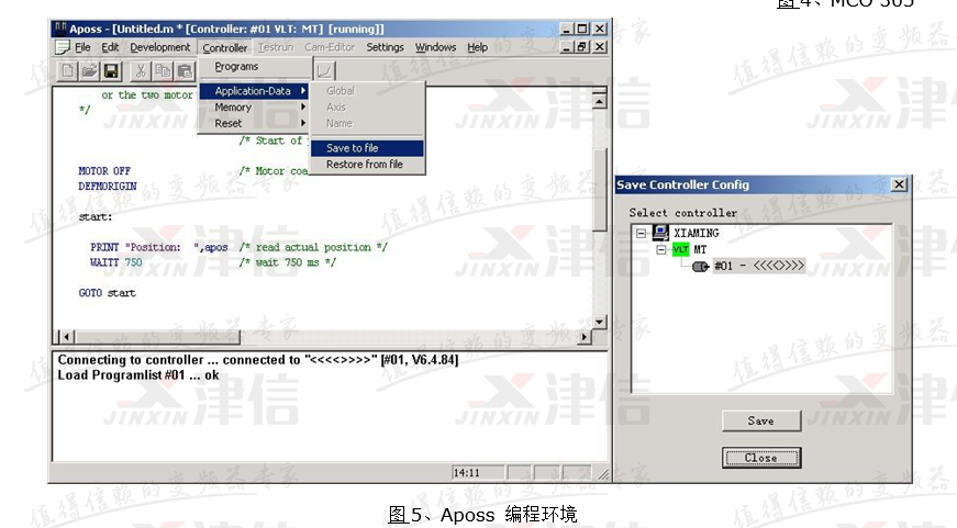 丹佛斯運動控制器使用丹佛斯公司開發的Aposs運動控制語言,其編程風格模仿C語言,并提供多種便利的宏指令,其界面如下圖5所示: