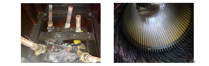 電機(jī)檢查:將電機(jī)的接線盒打開后發(fā)現(xiàn),電機(jī)的接線柱子已近完全燒壞。后將電機(jī)全部拆開發(fā)現(xiàn)內(nèi)部繞組完全燒毀。見下圖: