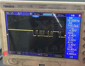 給變頻器送電后,變頻器面板顯示ERR37,根據故障解釋說明,檢查CPU小板反饋至控制卡的信號波形異常,有帶毛刺的尖雜波。測量點為下圖45,47號。