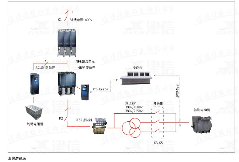 這個(gè)項(xiàng)目是Danfoss公司首次同天作電氣的合作項(xiàng)目;項(xiàng)目中采 用了以丹佛斯公司VACON® NX系列變頻器為電源核心的測(cè)試電源解決方案。單元+逆變單元+制動(dòng)單元)、正弦濾波器、升壓變壓器、制動(dòng)電阻以及輸出電壓切換開(kāi)關(guān)構(gòu)成。可以提供最高至2250V的正弦電壓輸出。天作電氣成柜。另外包含測(cè)試操作臺(tái),以及為了滿足測(cè)試工藝而選用的各種傳感器,功率分析儀器等。