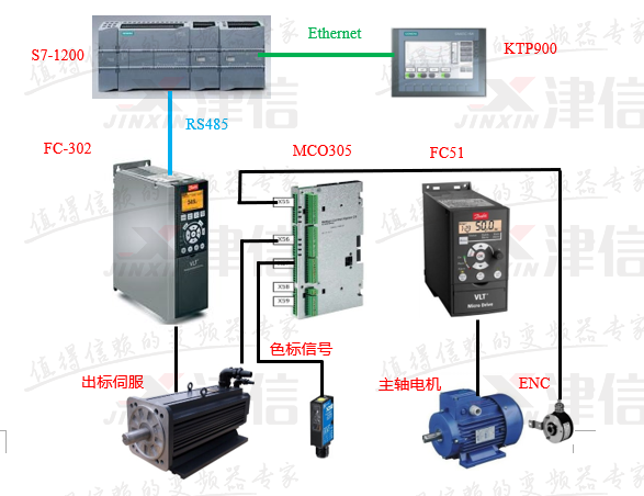 PLC與觸摸屏之間進(jìn)行Ethernet通訊,PLC與丹佛斯FC302變頻器之間進(jìn)行RS485通信,通過觸摸屏可以設(shè)置標(biāo)長、對標(biāo)位置、出標(biāo)起始位置等工藝參數(shù);FC302變頻器控制出標(biāo)伺服電機,以保證出標(biāo)精度及響應(yīng)精度。